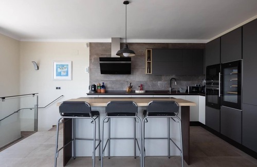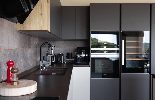 Shall we go inside the house?At the entrance we find a large open space shared by the kitchen - ultra modern - equipped with everything (oven, dishwasher, microwave, coffee maker, wine fridge) - a kitchen island with stools, a dining table with 8 chairs and a living area with two comfortable sofas and Smart TV. This area gives space to a large panoramic terrace - that you can access through French double doors - complete with sofas, table and chairs. The highlight of this space are the views of the surrounding area and the sea that gofrom Torre Valentina beach to Calonge and its castle. This floor is completed by 3 bathrooms, two of them ensuite and three bedrooms - two with a double bed and one with single beds. This last bedroom has and access to the outside with a porch with a table, two chairs and - of course - sea view like the other bedrooms. From this floor you can also access the garden area without having to go through the lower floor.The lower floor, facing the pool, is practically an independent studio, which can be accessed from the living room, down some stairs, or from the outside. Here we find a particular detail: a rustic-style wooden kitchen, fully equipped of course. Opposite, a living room with a sofa bed, Smart TV a table and chairs ideal for remote working and a bathroom. To preserve the privacy of the guests eventually sleeping on this floor, you can access the pool area directly from the first floor area without having to walk through this floor.This prestigious property that offers all modern comforts for your holiday: A BOSE music system that allows you to play music independently in all the bedrooms, living room and study, for the soundtrack of your holidays on the Costa Brava; high speed internet; air conditioning (air conditioning and heating) throughout the house; USB socket for mobile or PC and a Bose sound system installed throughout the house.The Villa is also equipped with alarm and protected by an automatic gate at the entrance with a video intercom.