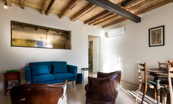 The flat is composed by a tasteful furnished livingroom with access to the balcony, a cosy double bedroom with a wide stained-glass windows to bring lots of light in, a bathroom with shower and a little functional kitchenette to cook some basic dishes.