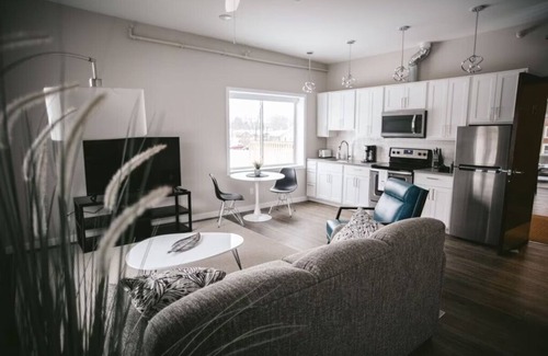 This studio unit comfortably sleeps 4 with a luxury queen bed in the Bedroom area and a queen-sized sleeper sofa in the Living Room area. Plush towels are provided in the modern and spacious bathroom. This space is uniquely located in downtown Bridgman in the upper lofts above local retail shops.