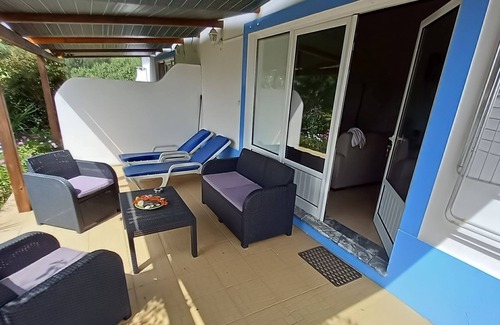 On the porch there are chairs and a table for you to relax.