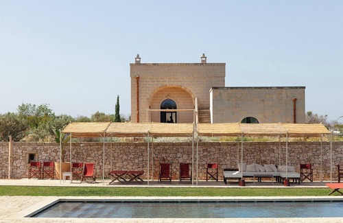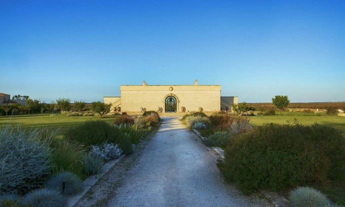 Beautifully designed, the architecture of the property takes inspiration from traditional Salentine building techniques and materials, evident in the lofty cross-vaulted ceilings, and the use of creamy, honey-hued local stone so typical of the area's masserie. The owners' Tuscan heritage is also represented in the gorgeous Florentine textiles, the impressive rusticated arch above the main entrance and some of the prestigious wooden furniture. The communal spaces are free-flowing, generously proportioned and luminous, while the bedrooms offer a sense of intimacy, seclusion and peace.