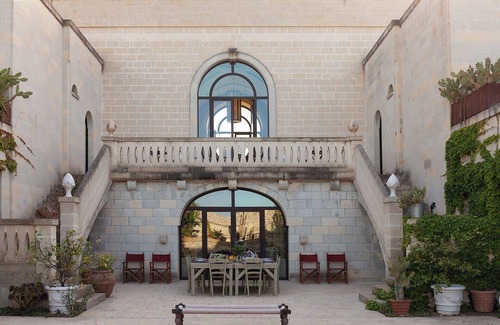 The various areas and levels of the grounds are delimited by dry stone walls built in the local soft creamy stone. Echoing the courtyard structures of traditional masserie, they also add a certain sense of mystery and magic. Nowhere is this more evident than in the "secret" sunken courtyard on the east-facing side of the house. Wonderfully secluded, and accessed both from the lower ground floor living area and from the the terrace outside the communal space on the first floor, this is an utterly private oasis. Climbing plants cling to the walls, a cactus garden adds a hint of exoticism, and quality outdoor furniture, including a large dining table, tempts guests to gather here for morning coffee, lazy afternoons and convivial dinners.