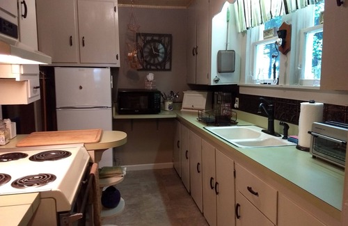 This is a two story cabin nestled in a private wooded area next to a stream. The upstairs has two private bedrooms with full size beds and a newly remodeled bathroom. Renters must provide their own bed linens, blankets, pillows, towels and bathroom products. The cabin can sleep additional two people by using the futon in a downstairs entertainment room. The kitchen is equipped with an electric stove, microwave, refrigerator, toaster oven and coffee pot. The pots and pans, plates, silverware and utensils are available for use. Also included is basic soaps, toilet paper, paper towels and cleaning products. Property has city water and garbage collection is on site. Wifi is available and there is cable TV for the main living room and both bedrooms. Cell phone service can be accessed, and a land line is available for local calls only.