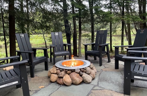 Just beyond the light-filled entryway, the living room awaits you with a stone faced gas fireplace, home theater television with surround sound and high-speed Wi-Fi. Tall windows frame the Moose River and trees outside – seasonal art in themselves, ablaze with color in fall or garlanded in snow. Sliding doors open to an outdoor living area with outdoor dining, Adirondack chairs, fire pit and the fresh balsam air of the forest.