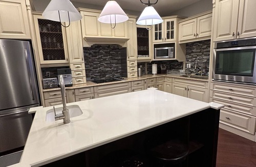 The cottage is newly renovated with contemporary designed furniture; futures three generous bedrooms including a master suite with fabulous lake views and ensuite full bathroom, king size bed with two nightstands, dresser and flatscreen tv. Two other large bedrooms with queen size beds, dresser, nightstands and also a flat screen tv. An open concept dining and living area with fully equipped kitchen and one share full bathroom.The cottage is also wired with a back up generator and an electric car station.