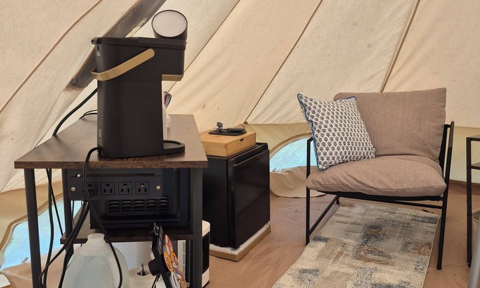 The Moonbeam Glamping Yurt offers an elevated camping experience with hotel-like amenities immersed in nature. Our glamping yurt features a loveseat that converts into a bed for 1-2 guests (linens included), ensuring a cozy sleeping arrangement for your stay.