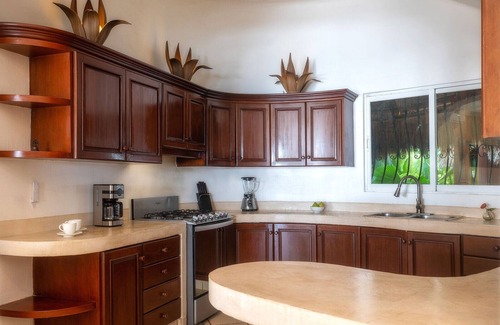 An exterior stairway goes up to the beautiful palapa-topped rooftop master bedroom. This is probably the most romantic room, featuring a private furnished deck and elevated views of the Caribbean on one side and lush tropical jungle on the other.
