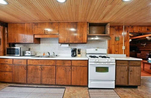With three bedrooms, this cabin can accommodate your whole group. Two bedrooms off the kitchen feature full-size beds, while the third, overlooking the lake, offers four twin beds—perfect for a family or group. The inviting living room provides plenty of space to gather, while the kitchen is outfitted with full-size appliances, cookware, and a lakeside dining table to enjoy meals with a view. The main level has a full bathroom, and for added convenience, there's a second bathroom downstairs.