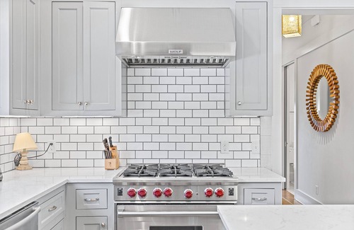 The KITCHEN comprises stylish dove-gray cabinets, pristine quartz countertops, and timeless white subway tiles. In the center of the kitchen is a convenient island with seating for two, and the premier appliance suite features a Wolf gas range, a specious refrigerator, a dishwasher, and an in-drawer microwave.