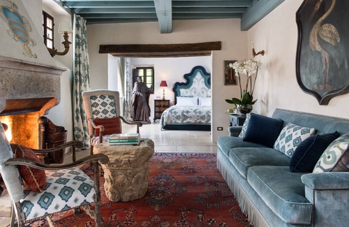 The interiors spaces feel like a sumptuous Renaissance manor: stone floors are covered by plush rugs, walls are lined with tapestries
