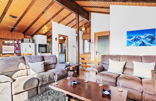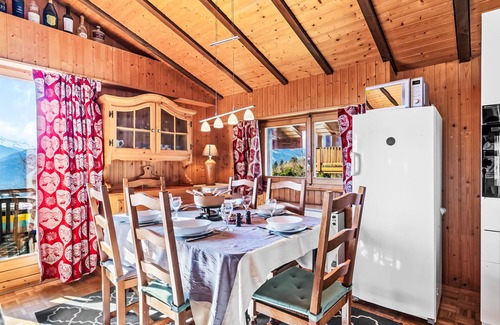 "Moulinettes 8", 4-room chalet 87 m2 on 2 levels. Living/dining room with sloping ceilings with open-hearth fireplace and cable TV (flat screen). Exit to the balcony, south facing position. Kitchenette (oven, dishwasher, 4 ceramic glass hob hotplates, toaster, kettle, microwave, freezer, electric coffee machine, Capsules for coffee machine (NESPRESSO) extra, fondue Set (cheese)). Shower/WC. On the lower ground floor: 1 room with 2 beds (90 cm, length 190 cm). Exit to the garden, south facing position. 1 room with 1 french bed (160 cm, length 200 cm). Exit to the garden, south facing position. 1 room with 2 beds (90 cm, length 190 cm). Bath/WC. Lawn. Terrace furniture, deck chairs (2). Beautiful view of the mountains and the valley. Facilities: washing machine, iron, hair dryer. Internet (WiFi, free). Please note: non-smokers only.