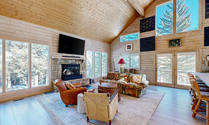 The high ceilings and open floor plan offer room for the whole family. Gather around the fireplace on chilly evenings or take in the views from the deck on warmer nights. The kitchen is equipped with new stainless steel appliances. Featuring a colorful array of wall art and fixtures, the dreamy main includes a cloudscape en suite complete with a luxurious soaking tub, spacious shower, and walk-in closet. The furnished loft space features a sunny rec room (with a sink and vanity), a cozy sitting area with a selection of books and games, and additional sleeping accommodations. High-speed WiFi allows you to connect with loved ones and share highlights during your amazing stay.