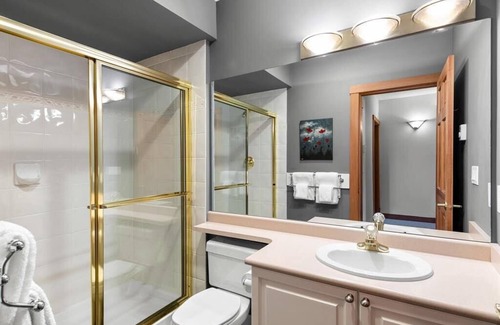The top level has a master bedroom with vaulted ceilings and a spacious ensuite bathroom includes a deep tub and shower. Wake up to views of Whistler and Blackcomb mountains from your bed. The second bedroom has double/single bunk beds and a small patio with views above the trees. A second spacious bathroom is on this level, with a walk-in shower.