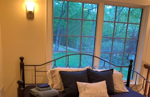 Set off of a private road in a serene 6 acre setting, no city noise, traffic etc. with hiking trails, two story windows overlooking a serene landscape. The only sounds are birds singing ( sometimes loud) and waterfall on the grounds. The pool is for your use only. Beginning in October, our Autumn season bursts with spectacular color. There is a lovely enclosed gated deck for comfortable meals under an umbrella on one side and oversized chairs and loveseat for a breakfast mimosa or an evening glass of wine as you grill or enjoy the fire pit just off the deck. The cottage is always spotless and sanitized for your protection. The pool is yours and no one will intrude however there are several natural swimming holes and community pools in the area for you to enjoy. The town center of Woodstock is 3 miles down the mountain. There are wonderful restaurants with outdoor seating or take away meals. Art galleries, hiking and bicycle trails, tennis, golf, boutiques, etc.From the upstairs bedrooms you also have clear view of the landscape and you may site a rabbit, a chipmunk or squirrel or deer keeping you company outside. Dogs are most welcome and love the freedom of running free on the grass. The smell of fresh country air is a special gift for all.