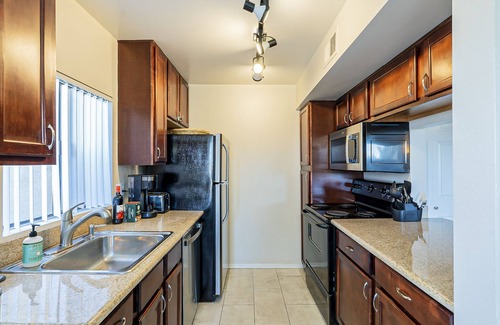 Come stay at this beautiful villa featuring GOLF course & CAMELBACK MOUNTAIN VIEWS! This ground floor, remodeled condo features tile flooring, maple cabinets & granite countertops. No stairs for this condo! The modern furnishings include a WiFi, smart TV in the living room plus an additional tv in the bedroom. The spacious bedroom features a king bed with an upgraded mattress for relaxing evenings. There is plenty of closet and storage space in the bedroom as well. There is also a work station/desk for your convenience. The living room features a pull out bed for additional sleeping options. The living room and bedroom both include ceiling fans to ensure a comfortable climate for your stay. There is the convenience of laundry with a washer/dryer in the suite. Two oversized patios features seating for four plus two comfortable lounge chairs for soaking in the sunshine.