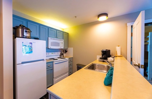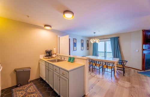 "The views from this condo are spectacular—overlooking the mountains, a lift, and even the Waffle House! It was perfect for our two families (3 adults and 4 kids), with a king and queen bunk bed setup in the second bedroom that worked beautifully. We enjoyed cooking pancakes and eggs in the well-equipped kitchen and loved dining with the scenic mountain backdrop. Both bathrooms were spacious, with plenty of hooks for helmets and gear. Though our trip was short, we made the most of the heated pool, local shops, restaurants, and of course, the Waffle House. Such a memorable stay!"