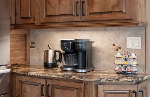 The main floor features a bright, open-concept kitchen and dining area, fully stocked with all the essentials (plus local coffee to start your mornings). Step into the grand living room and take in the panoramic mountain views, or head out to the wraparound deck for coffee at sunrise or cocktails at sunset.
