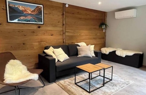 This apartment is one of 3 in a building that finished complete renovation in 2023. It has an updated Swiss chalet feel with wood accents, a warm feel, and garden with mountain background view.