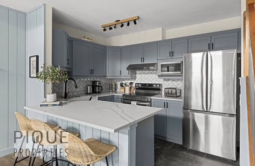 Our stylish brand new renovated loft home looks out at the spectacular Canadian Rocky Mountains. The condo features two bedrooms, the main with a King sized bed, and the loft feature custom built-in bunk bed sets, one Queen over Queen w/ stair access and the other is a Twin XL over Twin XL bunk w/ ladder access. Enjoy our private balcony stunning mountain views & Gas BBQ! There is a fully stocked kitchen where you can cook a delicious meal , 2 bathrooms w/ in-floor heating, and in-suite laundry!