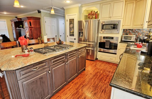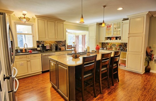 • Dining: Table for 6 with extra seating at the kitchen island.