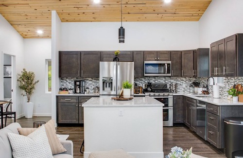 At the heart of Serotonin Chalet lies the open-concept living and kitchen area, featuring 16 ft. tall ceilings and magnificent floor-to-ceiling windows that offer uninterrupted views of the mountainous landscape and alpine pond. The blue stain pine ceiling sets the perfect modern cabin ambiance, complemented by the wood pellet fireplace, brand-new furniture, and remote-controlled blinds. Despite the feeling of being worlds away, you can stay connected with the 50" smart TV, 200mb Starlink WiFi, and Bluetooth-enabled record player.