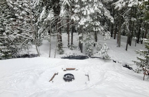 Exterior firepit w/ benches next to seasonal creek. *NO fires during burn ban