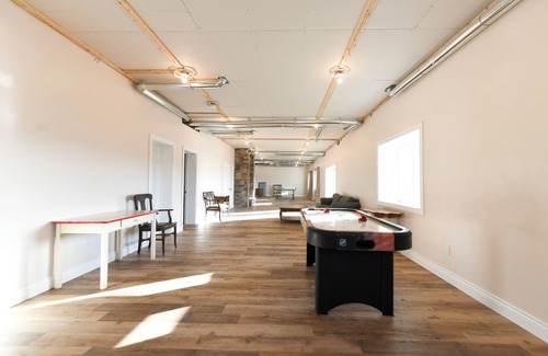 Head downstairs from the kitchen and discover a massive 70-foot-long games room—a hidden gem for family fun and relaxation. With soaring 10-foot ceilings and an open, industrial loft feel, this versatile space offers endless entertainment. Enjoy air hockey, ping pong, foosball, and gymnastic mats—perfect for rainy days, energetic kids, or a little friendly competition. It’s the ultimate hangout zone for guests of all ages.