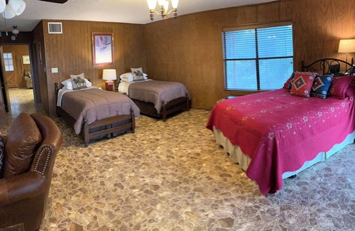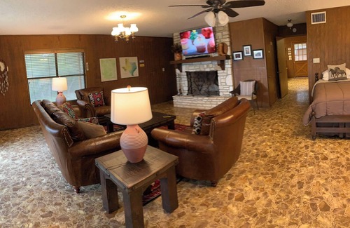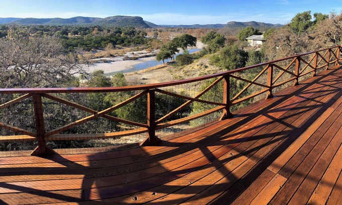 Mountain View Lodge lies on the western edge of the scenic Texas Hill Country, offering spectacular views & sunsets--great for gatherings large or small. The lodge sits high above crystal-clear, spring-fed Pulliam creek (Middle Prong of the Nueces River), which is ideal for swimming, tubing, and snorkeling. A 5-ft-deep swimming hole is at the lodge. Accommodations: Upstairs: 2 bedrooms with king beds. Downstairs there are beds for 8 people (additionally, there are 3 comfortable foam pads, pillows & bedding). Large decks on both levels with 4 private entrances to the house to avoid disturbing others. TELECOMMUTE FROM THE RANCH! Super-fast, fiber-optic internet. Do your Zoom business and school meetings wirelessly. A 55-inch Roku TV is downstairs and a 50-inch Roku TV is upstairs. Weather Conditions: It is not just summertime that's great in the Hill Country. Fall, spring, and even winter are some of the most wonderful weather days. Pets ages 1 year or over are welcome.