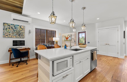 The living room features a wall of windows looking into the forest, perfect for bird watching or curling up next to a woodstove fire and watching the snowfall. The kitchen is open, bright, and fully equipped with All-Clad pans, spices, and all you need to cook your next meal. High-quality linens, Tempur-Pedic mattresses, independent heating/cooling in each bedroom create a luxurious setting for a restful night.