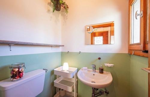 The shower (with a window) is set apart from the rest of the bathroom, placing the sink and toilet in a separate room with a window. Hairdryer is available.