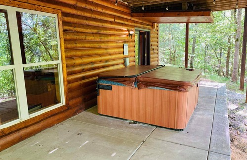 Easy access, private 3 story log cabin with lake and dock. Bedroom and full bath on each floor, loft with loveseat sleeper and tv, and sleeper sofa in the basement family room. Wrap around covered porch. 3 fireplaces, one on a screened deck with lake views, one inside, and a gas one in the basement family room. Family room downstairs with game room, bar, gas fireplace, and hot tub on rear patio. Fire pit area, and stairs all the way to the lake. Enjoy swimming, catch and release fishing, and kayaking on the lake. 6 ponds farm, a great place for the kids, is within walking distance.
