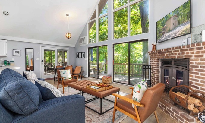 Mountain Mist Chalet has stunning mountain views, a spacious living area, and wood burning fireplace for cool nights. The open floor plan and tall windows make for a perfect getaway for couples, small groups or time with friends.