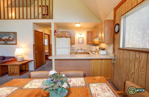 The open, spacious great room includes a dining room and living room with a wood-burning fireplace. Firewood is provided from late fall through early spring. The kitchen is conveniently located adjacent to the great room and includes basic cookware, tableware, appliances, and a basket-style drip coffee maker (filters provided, but please bring your favorite grind). The main floor also includes a large main bedroom with king bed, a second bedroom with double bed, and full bath. The cozy loft has two twin beds and full bath. The finished basement includes a second living room, with a futon, a bathroom with Jacuzzi tub and sauna, and laundry room. Sleeps 8.