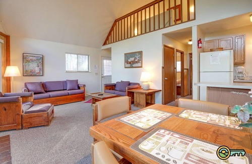 Villa #119 is a traditional mountain chalet that overlooks the Bryce Resort golf course and Bryce Mountain. The great room's huge windows, doors, and deck keep you close to nature and gazing at the view. Please note that access to this mountainside chalet includes seven steps down to entry level from the parking area. Located within the Bryce Resort community, this chalet is about 1.2 miles from the Resort's main lodge and ski/bike lifts, and 0.8 miles from the Basye Community Store.