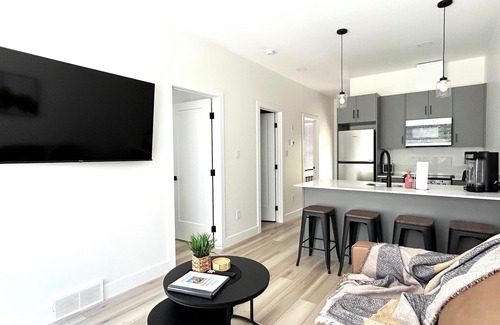 Inside, you will find two cozy bedrooms with queen beds and soft linens —one of which includes a closet for added storage. A twin fold-out floor mattress is available upon request. The bright, modern bathroom includes a full-size tub/shower and additional shelving for storage.