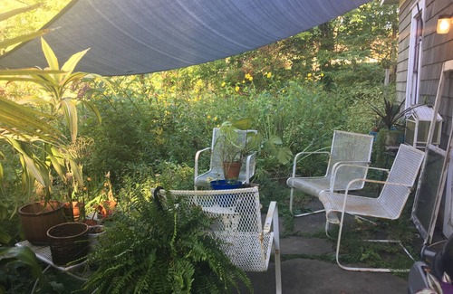 An indoor and outdoor paradise. Some of the best hiking in the world starts right at your door. The entire ground floor is 'great room' with wood stove, bar, open kitchen, full bath. The radiant heated concrete floor of this space used to be where Cragsmoorians went to get their cars serviced. The walls are lined with the owner's extensive library. The front doors open onto a shaded patio with comfortable seating and a well-used barbecue. Upstairs the master bedroom has its own private deck. The second bedroom (we call it the Map Room) has a collection of atlases, hiking guides and maps.
