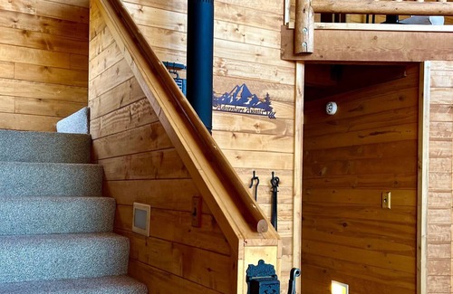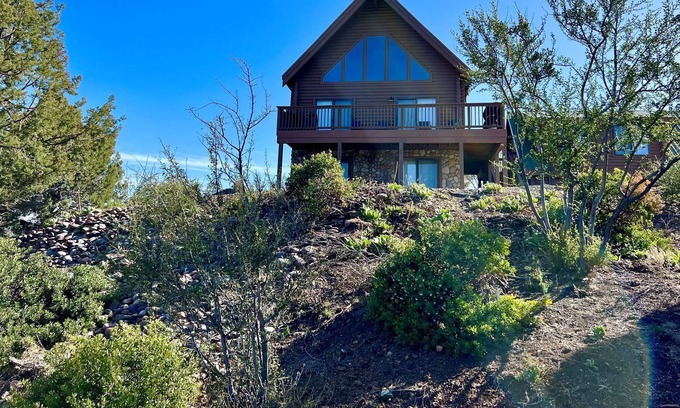 Mountainview Lodge is a beautiful cabin located just 9.6 miles or 22 minutes from downtown Prescott. This tall-pines property is everything you are looking for in your dream vacation in the forest. Mountainview Lodge has 3 bedrooms and 3 bathrooms and sleeps 7 guests. It's a 3-level home with exterior entry stairs. The step count is high but your fitness level will improve! On the main level you have 2 bedrooms - one with a queen bed and the other with a full/twin bunkbed. These bedrooms share a full, hall bathroom with a walk-in shower. The kitchen has an open-air design with tall ceilings and knotty-pine walls. A darling, tiled-in, wood-burning stove provides ambiance and additional warmth for cooler months. (Duraflame logs are preferred instead of real wood. This keeps safety and cleanliness better and more easily managed.) The kitchen is modern and cheerful with evergreen cabinets and country charm. It has a gas range/stove and is very well stocked with all dishes, pots and pans to satisfy the chef in your party. From simple snacks to gourmet meals, friends and family will be satiated and satisfied. The dining room has a polished-wood, 6-seat table with 2 bar stools for additional seating. Two sliding glass doors will get you out to the deck which has spectacular views. The deck faces north/east off the kitchen and wraps around to the north/west, offering long views all the way to Flagstaff and the San Francisco Peaks! This space is very usable from morning to evening for your first cup of coffee to your last sip of wine. Comfortable seating and a cute, little bar offers choices to everyone gathering outside to enjoy Arizona’s finest vistas. There is a gas grill for outdoor cooking. Propane is provided. Let’s go downstairs! This is where the fun begins. Child/dog safety gates are provided at the top of carpeted staircase to keep young children or pets from accessing the game room stairs. The lower level has a cozy couch and cow-print chairs around a large Smart TV. Smart TVs are a technological convergence of computers, televisions, and digital media players. A Smart TV can access the internet via Wi-Fi whereas a normal TV would need a separate device. A Smart TV also has built-in apps that are ready to login to with a subscription. (The main difference between a Smart TV and normal TV is that a Smart TV is smarter than a normal TV. Haha!) Sling TV has been set-up for complimentary Live TV. A mini wet-bar with sink and fridge will keep you from running up and down the stairs as you relax with your favorite beverage, movie or sports program. You can sit at the bar or may choose the darling whiskey barrel table. A pool table is in the adjoining room with another small, Smart TV and full bathroom with a walk-in shower. A sturdy dog crate is provided to keep pets safe and confined if unattended or sleeping. Another slider leads you outside to a concrete patio with tables and chairs. Games and puzzles are provided for family entertainment. The Primary Suite is on the upper level with a king bed and en-suite bathroom. This attractive bedroom has a cute little, south-facing deck for stolen moments in the early morning or late at night. The bathroom is spacious with walk-in shower and double-vanity sink. Wi-Fi, washer/dryer, A/C and Central Heat bring modern conveniences to country living. Mountainview Lodge has a well that is supplemented with hauled water in a tank. We ask that you conserve water and utilities as a respectable guest. Whether it's quick get-away weekend or your whole summer, Mountainview Lodge represents Prescott's forested mountain accommodations at their finest!