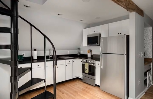 The cabin features 2 bedrooms, one with a queen bed and TV, and one with 2 twin beds. The twin bedroom features an en suite half-bath. To access the upstairs, there is a small spiral stair case. There is also a pull-out couch on the main floor that sleeps 2. For the fitness ethusiast, there is workout equipment for your use (no pressure!) - light weights, resistance bands, mat, ab roller, jump rope.