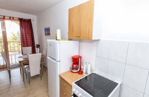 2-room apartment 45 m2 on 1st floor, south-west facing position. Living/dining room 20 m2 with 1 double sofabed (130 cm, length 190 cm), satellite TV (flat screen), air conditioning. Exit to the terrace. 1 room with 1 french bed (180 cm, length 200 cm). Open kitchen (oven, dishwasher, 4 ceramic glass hob hotplates, freezer, electric coffee machine). Shower/WC. No heating option. Terrace 15 m2, roofed. Terrace furniture. View of the sea. Facilities: Internet (WiFi, free).