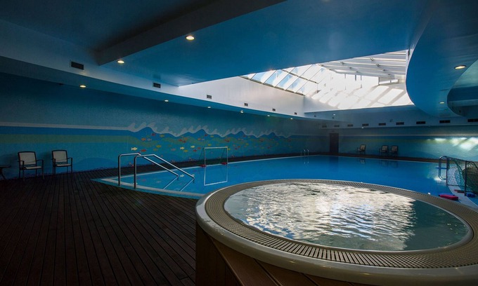 An indoor pool, an outdoor pool, a children's pool, and a hot tub are on site. Other recreational amenities include a sauna and a fitness center.