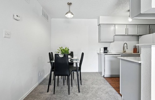 Stylish, fully furnished apartment in Austin’s Mueller neighborhood. Features include quartz countertops, modern lighting, sleek hardware, and plenty of natural light. Enjoy a spacious layout with a comfy living area, fully equipped kitchen, and in-unit washer/dryer. Designed for comfort and convenience—perfect for short or long stays!