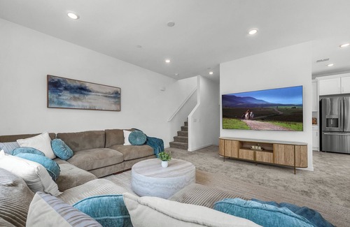 The cozy living room offers plush seating and a 75" Smart TV loaded with streaming apps like Netflix and Disney+, making it the perfect spot to unwind after a day of work or exploration.