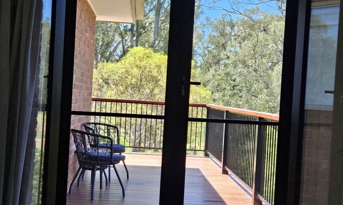 The upstairs bedroom has a queen bed and french doors that lead out onto the deck or you could just lay in bed and enjoy the scenery. The downstairs bedrooms each have large glass sliding doors that open up to the garden and lawn area. All bedrooms have block out curtains so you can enjoy a sleep in or an afternoon nap. The large kitchen has everything you need to cook up a storm or you could enjoy a BBQ out on the deck.