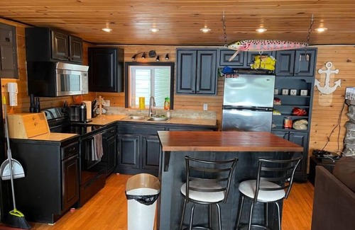.The Main Cottage features a cozy living area adorned with rustic pine accents, flat screen TV, a natural stone fireplace, and stunning lake vistas, With Three well-appointed bedrooms and one bathroom, the Main Cottage promises restful slumbers after a day of adventure.
