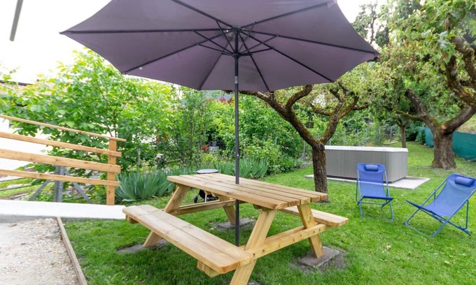 Gite on the 1st floor of the house with outside access, comprising a living room-kitchen lounge area, 2 bedrooms (1 double bed 140x190 cm / 2 single beds 80x190 cm which can be joined to form 1 double bed 160x190 cm), a bathroom (walk-in shower and WC). Balcony. Fenced garden with spa (summer only). Parking. Detached house located in the lower part of Macot la Plagne, a typical Tarentaise village at the foot of major ski resorts. Fenced garden with flowers and trees, bordering a stream, with a spa (access only from April to October depending on weather conditions). Lockable ski and bike storage. Private parking for 2 cars. Public charging station 150 m away.