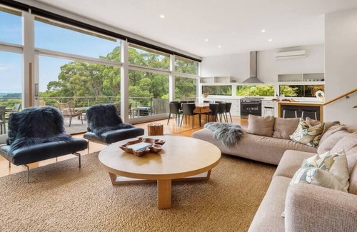 The sleeping quarters at Myers Rd Villa are located upstairs and comprise a beautifully decorated Master King Suite with stunning countryside and ocean views and a spacious modern ensuite (walk in shower, vanity and toilet). The second bedroom has a King bed which can also be split into 2 x King Singles, while the third bedroom is perfect for kids with a window seat and two sets of Single Bunk Beds. All rooms feature stylish furnishings, beautiful artwork, and contemporary decor, which is consistent throughout the house. The central, modern bathroom has a shower and vanity, and for added convenience and privacy, a separate toilet is also available.