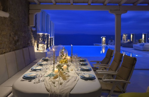 Calypso Sunset Villa has 180 degrees views, spacious terraces, a large infinity edged swimming pool, a hot tub attached to the pool with spectacular views, a pergola-covered outdoor dining area, huge dining table made of rock for 20 persons, two large built in seating areas and comfortable sun beds.