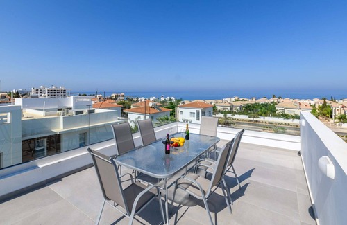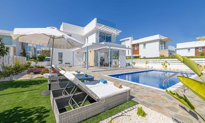 An exclusive combination of contemporary architecture and scenic surroundings, Mylos Lifestyle Seaview Villa #15 is a development that offers a luxurious standard of living within one of the most beautiful areas of Cyprus. The villa has been designed and constructed with precision and incorporates high quality materials with a finishing touch that will satisfy the highest of expectations.Located within stunning surroundings in the highly popular Green Bay area of Protaras, the villa's elevated position provides magnificent sea views of the Mediterranean. Numerous sandy beaches with crystal clear waters are located within strolling distance of the villas, including two of the areas EU awarded Blue Flag beaches. The villa features 3 comfortable double bedrooms, one of which is located on ground floor and direct access to the villa's outside area and private pool, while both bedrooms upstairs both have their own private verandas and an ensuite shower room. The spacious outdoor areas with private pool, shaded veranda and gated parking are just a few of the many admirable features of the Villa, whilst marble and stone finishes add to the ambiance of the development.--------------- 𝗠𝗘𝗗𝗜𝗔 𝗧𝗘𝗖𝗛𝗡𝗢𝗟𝗢𝗚𝗬Free High-Speed WiFi, Free Air Conditioning (limited usage allowance) Free Satellite TV with multiple channels and different languages to choose from; Watch your favourite movies, TV shows and Sport events live and on demand! 𝗧𝗥𝗔𝗩𝗘𝗟𝗟𝗜𝗡𝗚 𝗪𝗜𝗧𝗛 𝗜𝗡𝗙𝗔𝗡𝗧 𝗖𝗛𝗜𝗟𝗗Family holidays are one of life’s most important events. After all, how often do you get these precious moments to unwind together? That being said, the thought of taking little ones away can be a daunting one you don't want to come home more stressed than when you went! That's why we've decided to provide a number of essential safety extras, specifically with toddlers and babies in mind.Any safety extra you choose to add to your booking, will be waiting for you upon arrival, so all you have to focus on is first steps and fun in the sun. Get ready for unforgettable family moments! 𝗣𝗥𝗜𝗖𝗘 𝗜𝗡𝗖𝗟𝗨𝗗𝗘𝗦Our price always includes the following: Air-conditioning (limited usage allowance), Basic Pre-Arrival and Departure clean, fresh bed-linen towels, High-Speed WiFi, Free Parking.Age requirements: Young groups under the age of 25 are not accepted.