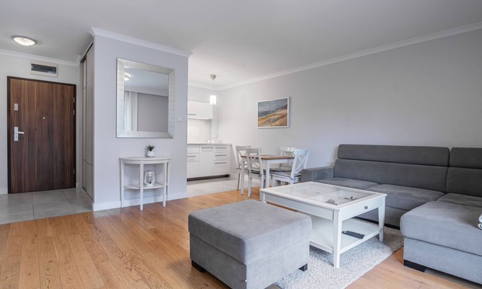 Modern, comfortable apartment block "Na Wczasowej", built in 2014. 700 m from the sea, in the countryside. In the house: lift. Communal covered parking. Grocery, supermarket 100 m, restaurant 150 m, bus stop 120 m, sandy beach 700 m, indoor swimming pool 150 m. Tennis 150 m. Nearby attractions: Grand Hotel Lubicz SPA 150 m. Groups of teenagers on request only. Guarded residence.