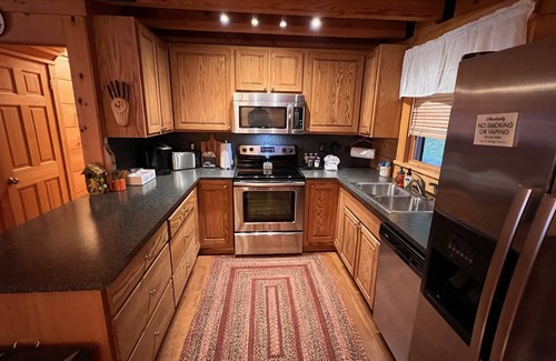The cabin boasts three well-appointed bedrooms suitable for up to 8 guests. Two bedrooms have king size beds, while the third has two twin beds. A futon in the game room along with a twin size roll away bed complete the sleeping arrangements. All linens and pillows provided along with extra blankets.
